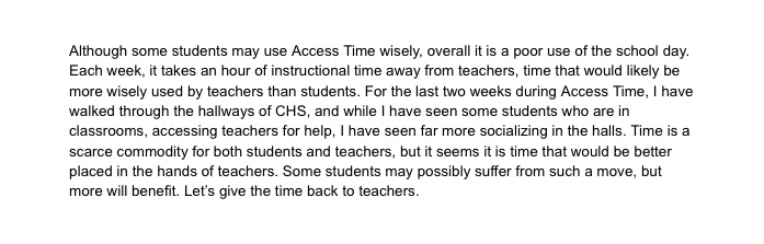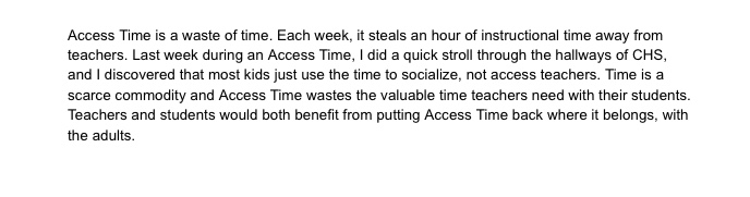 So, when I put the three texts in front of my kids today. I will first ask them to hear the words, asking them where and if there were places where they listened and why. The first is a poem I met yesterday in a meeting. The latter two are quick little arguments I wrote up about our Access Time here at CHS. We have not talked about argument or rhetoric yet. I want to see what the kids pick up with their ears before I formally introduce those elements.