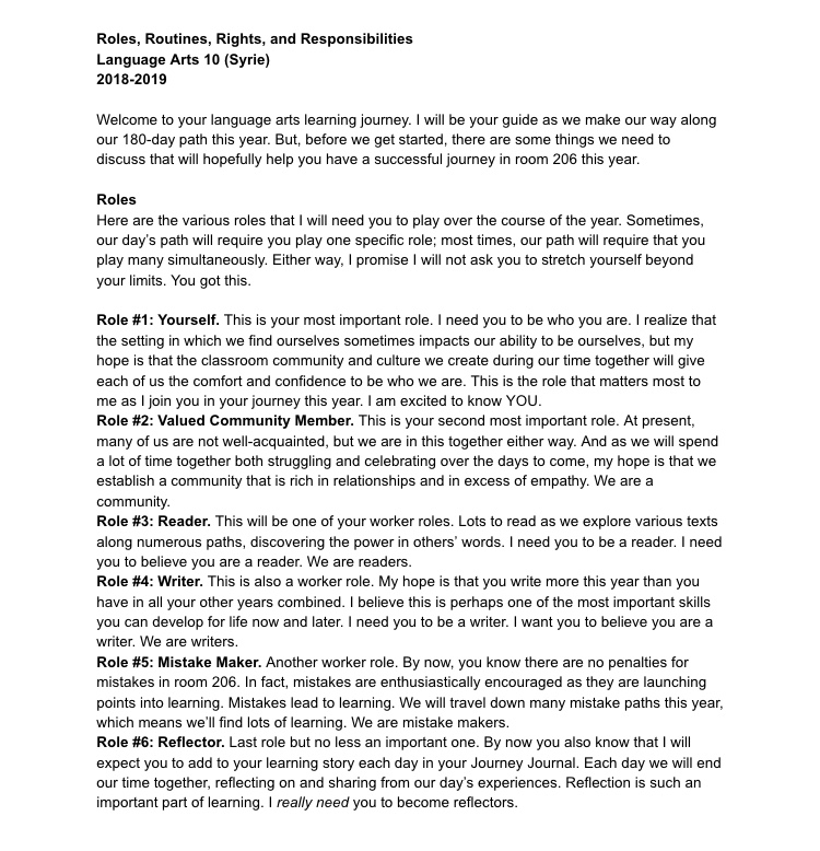 Rules on day four? Well, kinda. I don’t actually call them rules ’cause…well, they sound too “ruley.” Instead, I present my policies and procedures as “Roles, Routines, Rights, and Responsibilities.” The four R’s. And while they are important to our journey, they still take a backseat to the “R-est” of R’s: relationships. That’s how we began our journey last week. We started with the people. This week, we can begin with the policies.